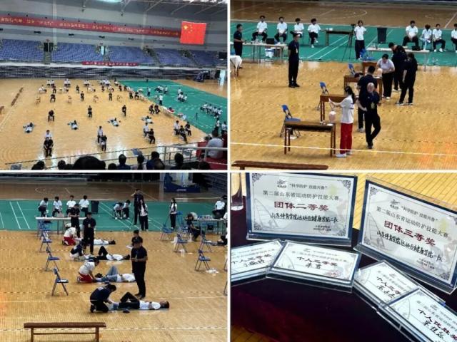 ? 2025年9月27日至28日,由中共山东省委省直机关工作委员会、山东省体育局、山东省总工会等单位联合主办,山东省运动康复研究中心、淄博市体育局等单位承办的山东省“技能兴鲁”职业技能大赛暨第二届运动防护技能大赛在淄博市体育中心成功举办。山东体育学院运动与健康学院派出两支代表队共8名学生参赛,在比赛中发挥出色,最终在全省所有队伍中荣获团体二等奖、团体三等奖各一项,三名同学荣获个人三等奖,一名同学荣获个人优胜奖,展现了学院学子扎实的专业技能和良好的精神风貌。